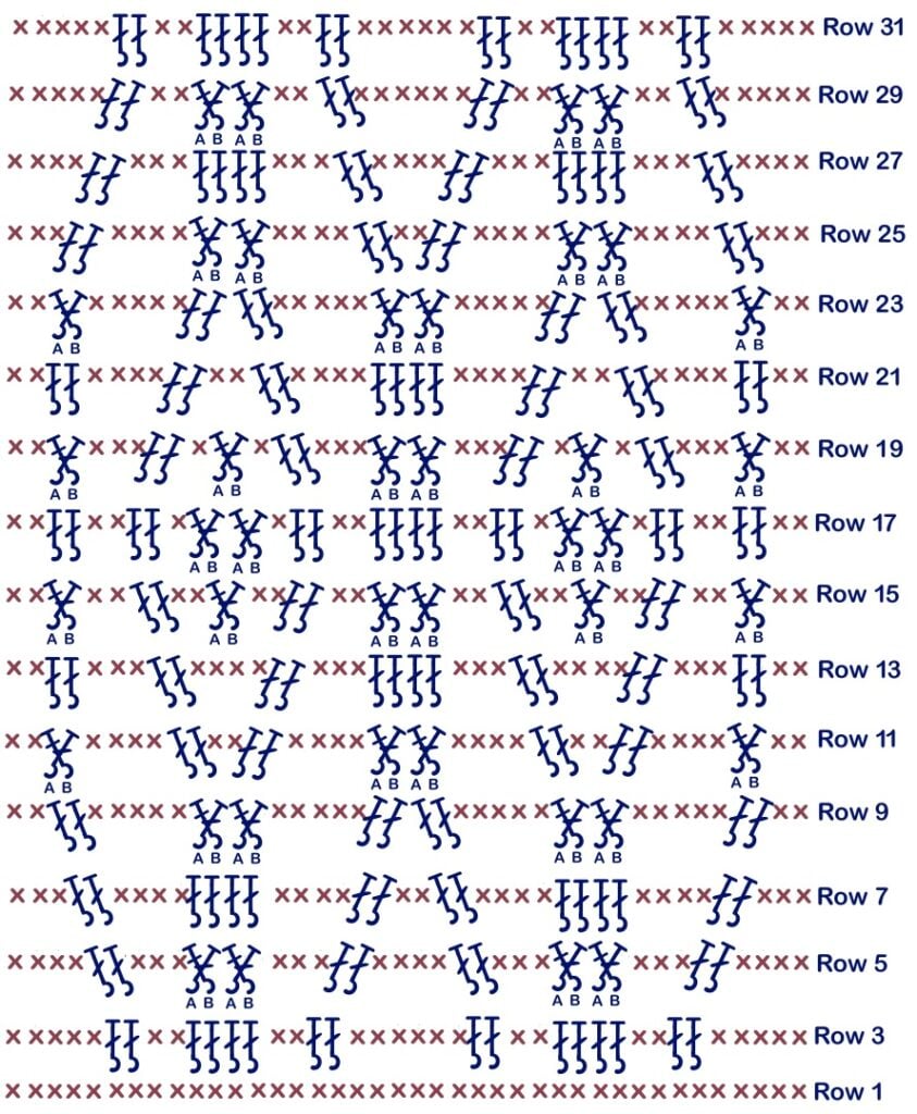 Repeat Row 4 to 31 – 7 MORE times ending the last repeat on Row 30 do NOT cut your and move onto Blanket Trim Instructions below.